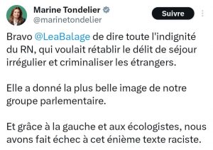 Dire que le texte du Groupe Rassemblement National visant à rétablir le délit de séjour irrégulier est "raciste", ce n’est pas seulement insulter les 11 millions d’électeurs du Rassemblement National, mais aussi les 84 % des Français qui y sont favorables (Odoxa) !