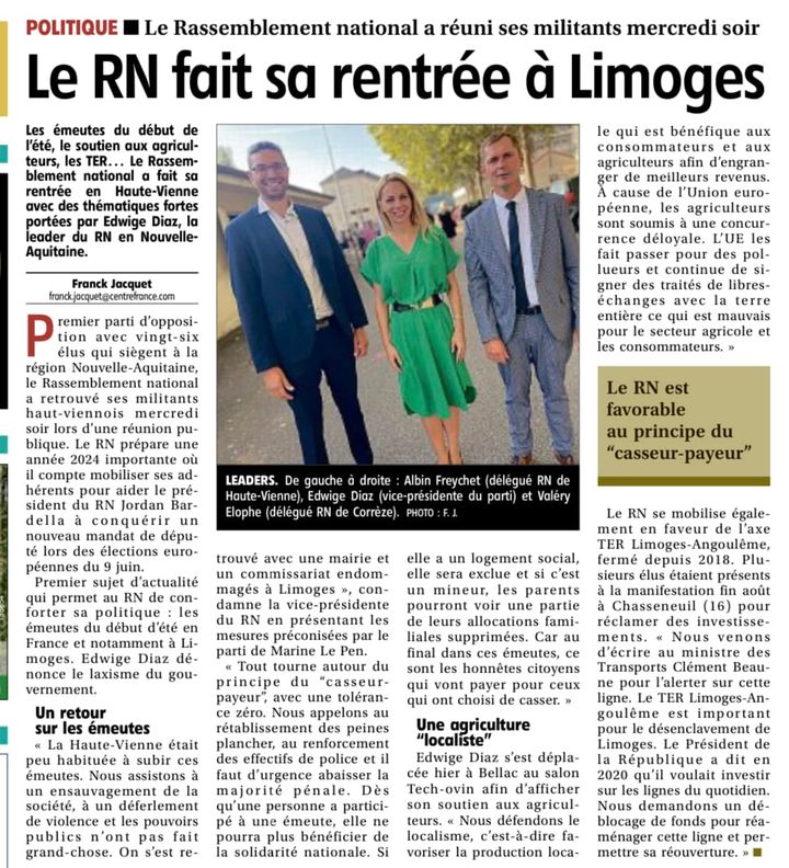 08 Sep Actualités💶 Principe du « casseur-payeur », 🌾 Soutien aux agriculteurs, 🚊Désenclavement par le TER, 🗳️Élections… Posted on 8 septembre 2023 by Edwige Diaz ☀️ Je vous donne rendez-vous ce soir à Marseille pour la rentrée du Rassemblement National… 🇫🇷 Salle comble hier pour la rentrée du Rassemblement National des Bouches-du-Rhône ! Merci à…