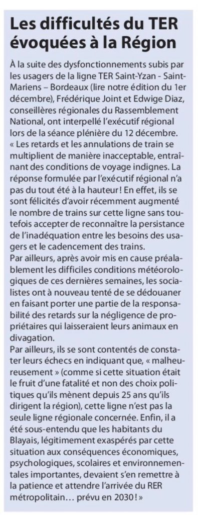 23 Déc Actualités📰 TRAIN D’ENFER Ligne 43.1U et 15 [Bordeaux/St-Mariens/Saintes] Haute-Gironde revient sur la séance plénière du… Posted on 23 décembre 2023 by Edwige Diaz 📺 La priorité nationale est un devoir à l’égard des Français les plus modestes. Dans… ✨Sur le marché de Saint-André-De-Cubzac, je suis venue souhaiter un Joyeux Noël aux commerçants et…