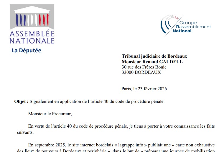 Contre les insidieux appels à la violence lancés par un site internet d’extrême gauche à Bordeaux, je saisis le Procureur de la République pour protéger nos forces de l’ordre, nos élus et nos entreprises !