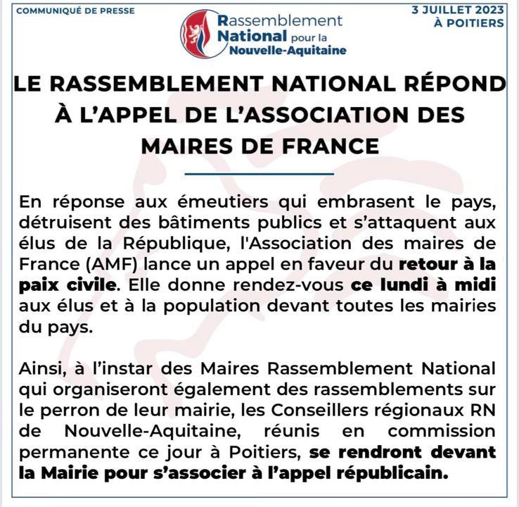 Agenda📍En réponse aux émeutiers qui embrasent le pays, détruisent des bâtiments publics et s’attaquent aux… Posted on 3 juillet 2023 by Edwige Diaz 03 Juil Continuer la lecture →
