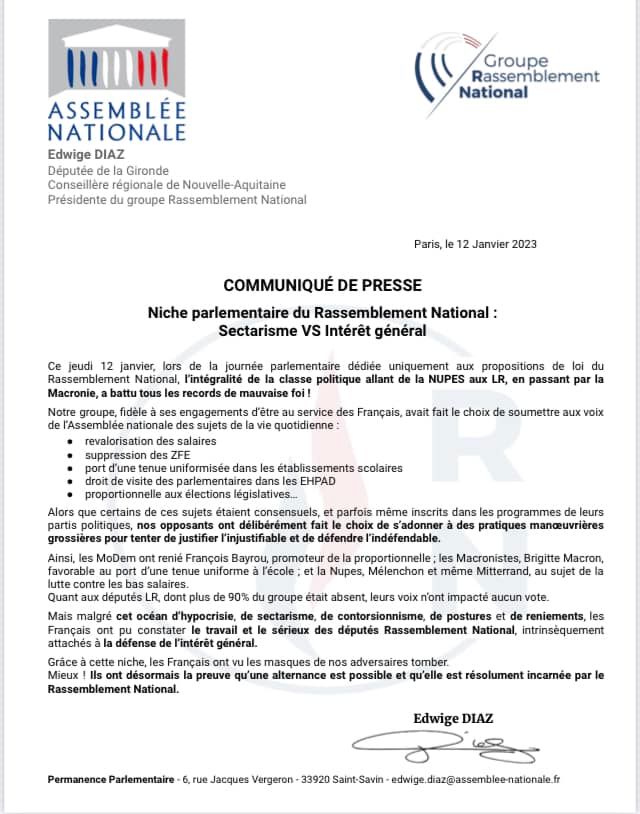 CommuniquésNiche parlementaire du Groupe Rassemblement National: Sectarisme VS Intérêt général ✍🏻 Retrouvez mon communiqué de… Posted on 13 janvier 2023 by Edwige Diaz 13 Jan Continuer la lecture →