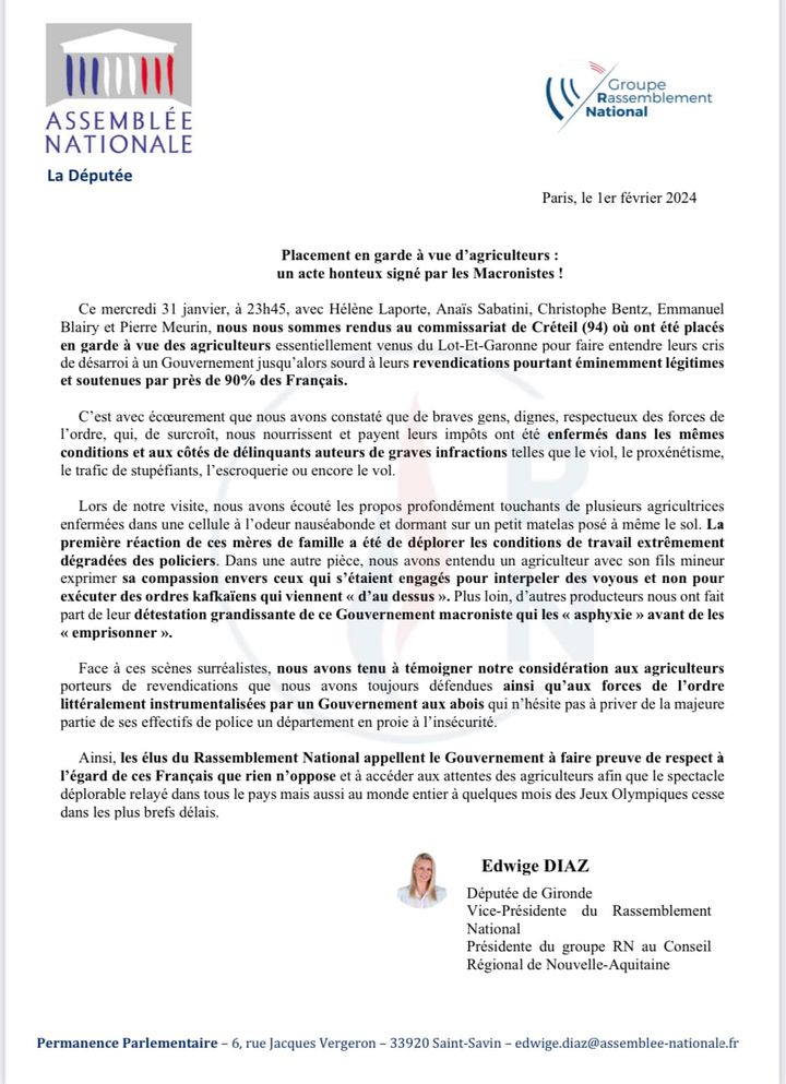 🚨Placement en garde à vue d’agriculteurs de Nouvelle-Aquitaine: un acte honteux signé par les Macronistes ! Retrouvez mon communiqué de presse: Ce mercredi 31 janvier, à 23h30, avec Hélène Laporte, Anaïs Sabatini – Députée des Pyrénées-Orientales, Christophe Bentz, Emmanuel Blairy et Pierre Meurin, nous nous sommes rendus au commissariat de Créteil (94) où ont été […]