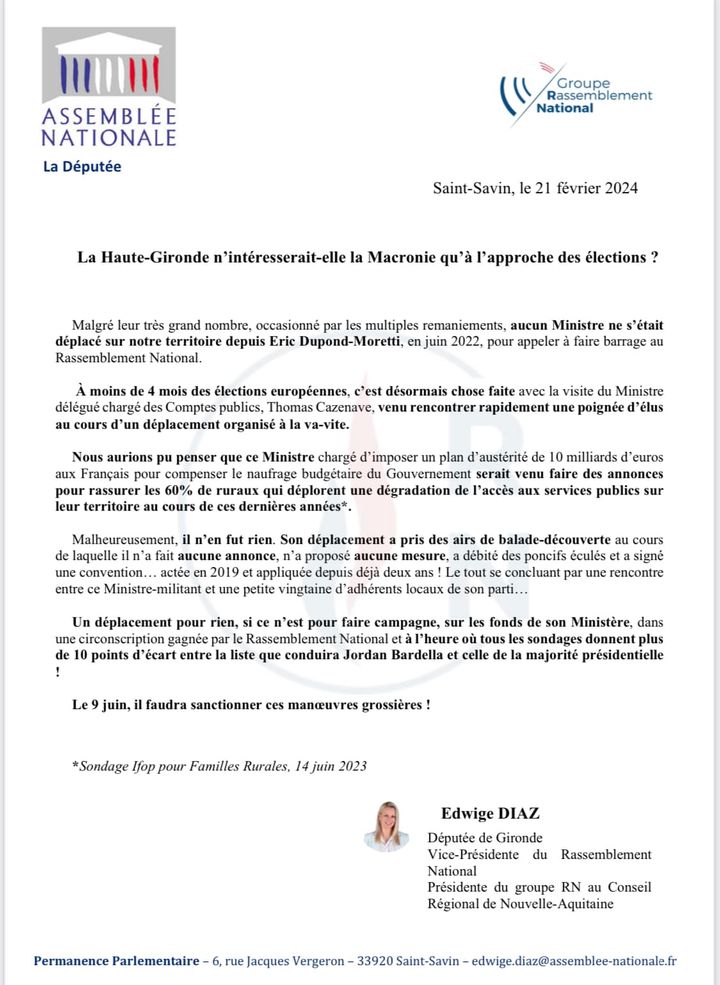 La Haute-Gironde n’intéresserait-elle la Macronie qu’à l’approche des élections ? 🗳️ 🖊️ Retrouvez mon communiqué de presse, à la suite de la visite éclair d’un Ministre sur la 11e circonscription de Gironde : « Malgré leur très grand nombre, occasionné par les multiples remaniements, aucun Ministre ne s’était déplacé sur notre territoire depuis Eric Dupond-Moretti, […]