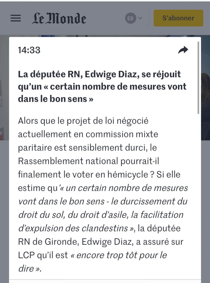 19 Déc ActualitésCommission Mixte Paritaire sur le #PJLImmigration Posted on 19 décembre 2023 by Edwige Diaz 📰 « C’est un cirque, rien n’avait été ficelé. L’existence de cette para-CMP reflète la… 🎥 « Nous souhaitons que les prestations sociales, notamment les allocations familiales, soient réservées aux…