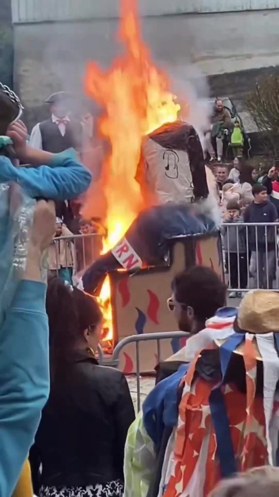 À Hasparren, dans les Pyrénées-Atlantiques, l’extrême gauche détourne le carnaval traditionnel en brûlant un mannequin à l’effigie de Jordan Bardella.