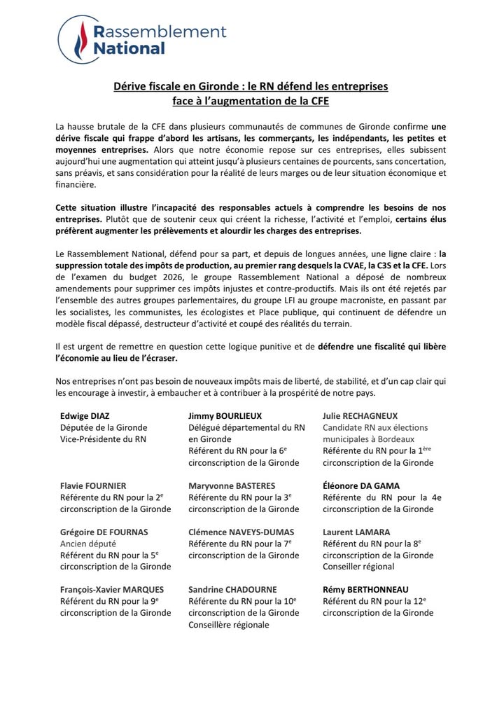 💸 Dérive fiscale en Gironde : le Rassemblement National défend les entreprises face à l’augmentation de la CFE !