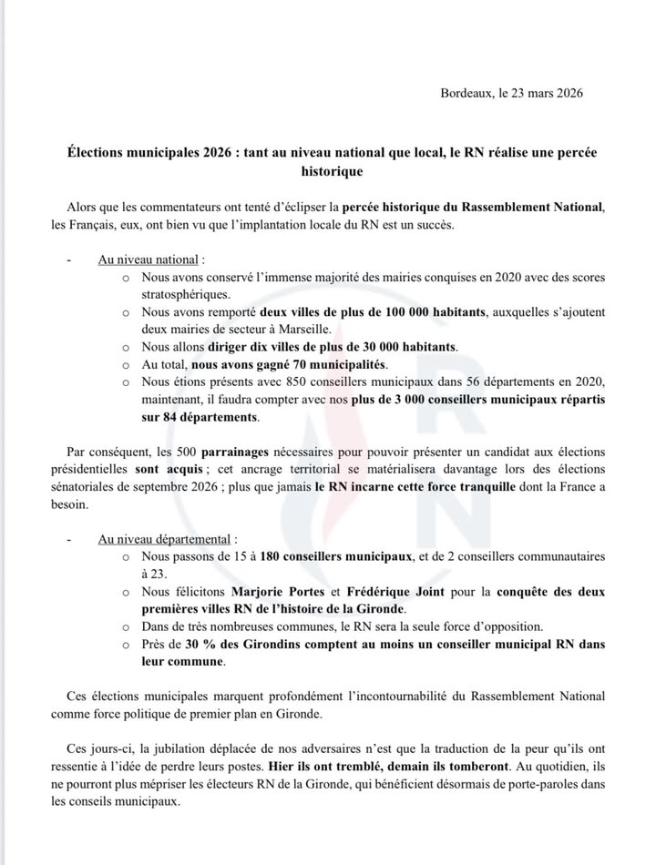 Ces jours-ci, la jubilation déplacée de nos adversaires n’est que la traduction de la peur qu’ils ont ressentie à l’idée de perdre leurs postes. Hier ils ont tremblé, demain ils tomberont. Au quotidien, ils ne pourront plus mépriser les électeurs RN de la Gironde, qui bénéficient désormais de porte-paroles dans les conseils municipaux. Aux électeurs de droite, nous tendons une nouvelle fois la main afin qu’ils se détournent de leurs dirigeants qui ont refusé le pacte de gouvernance que nous leur avons proposé, et qui ont ainsi facilité la victoire de la gauche. À Nîmes, Marseille et Saint-André-de-Cubzac, la droite a ajouté le déshonneur