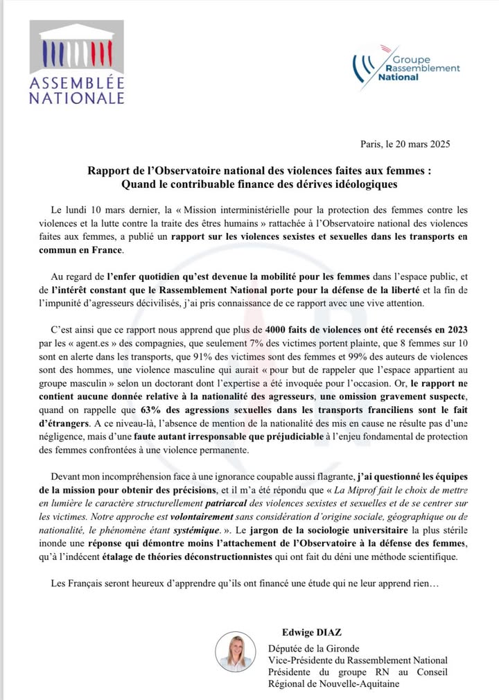 Au regard de l’enfer quotidien qu’est devenue la mobilité pour les femmes dans l’espace public, et de l’intérêt constant que le Rassemblement National porte pour la défense de la liberté et la fin de l’impunité d’agresseurs décivilisés, j’ai pris connaissance de ce rapport avec une vive attention.