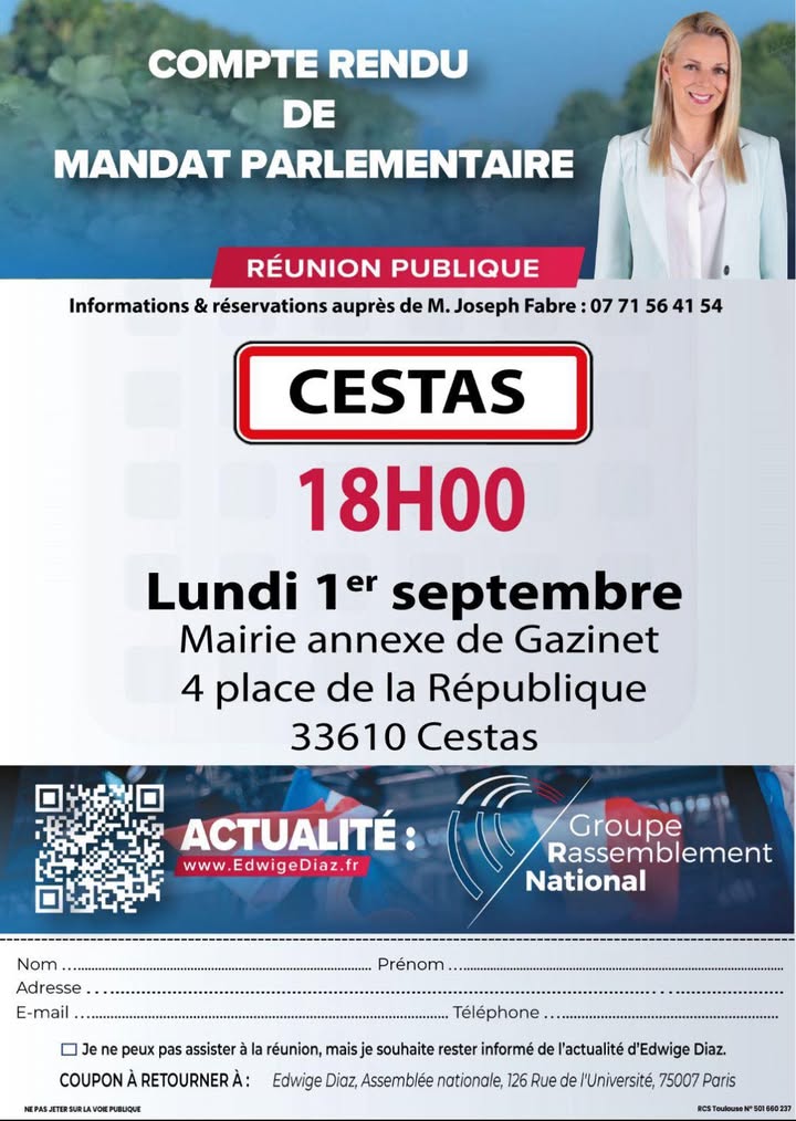 01 Sep AgendaRencontre à Cestas : Rejoignez-nous ce soir ! Posted on 1 septembre 2025 by Edwige Diaz 😁 À ce soir à Cestas, avec Joseph Fabre, Clemence Naveys Dumas et Jimmy Bourlieux ! Révolte contre les dérives macronistes : un nouveau cap pour la France ! Priorités législatives en décalage face aux défis actuels
