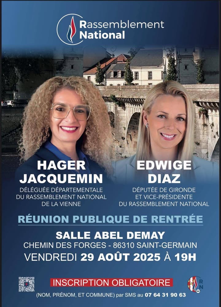 😁 Chers amis du Rassemblement National de la Vienne, j’aurai le plaisir de vous retrouver, en présence d’Hager Jacquemin, déléguée départementale :