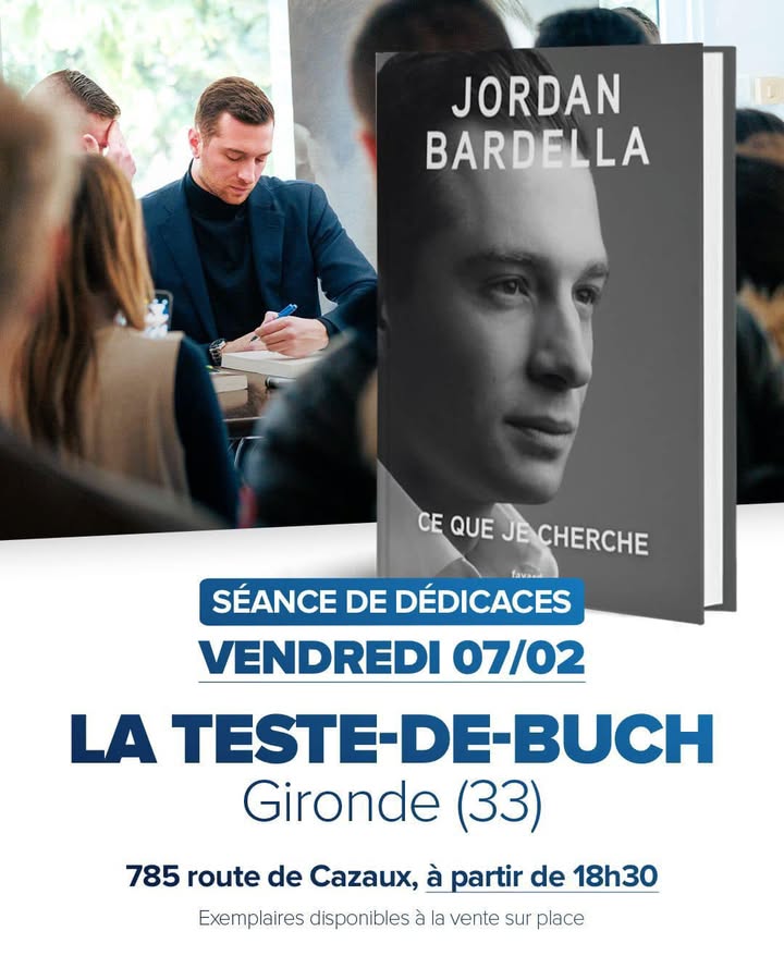Jordan Bardella sera en Gironde, à La Teste-De-Buch, vendredi 7 février pour dédicacer son livre « Ce que je cherche ».