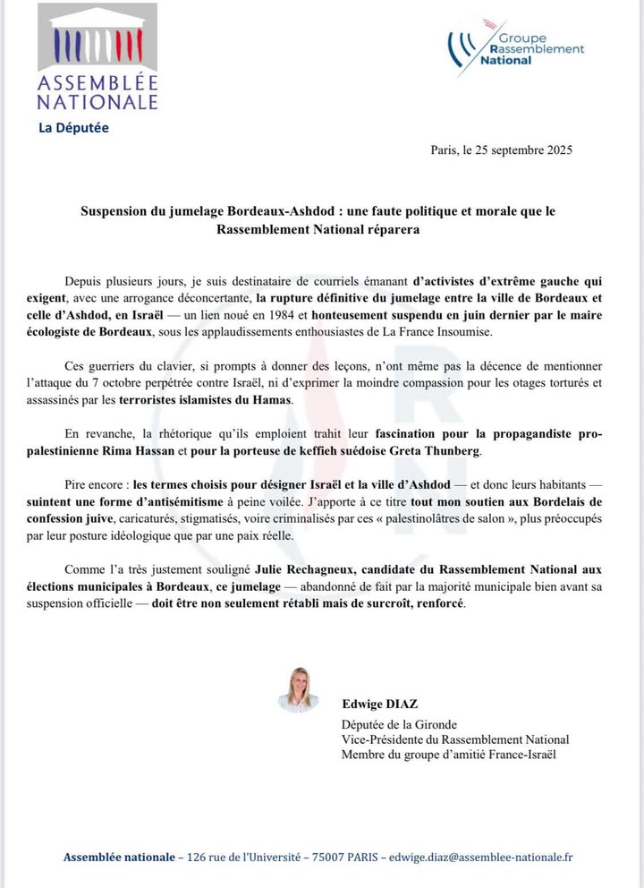 🇫🇷🇮🇱Suspension du jumelage Bordeaux-Ashdod: une faute politique et morale que le Rassemblement National réparera