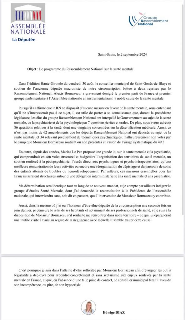 🖊️ Dans l’édition Haute-Gironde du vendredi 30 août, le conseiller municipal de Saint-Genès-de-Blaye et soutien de l’ancienne députée macroniste de notre circonscription battue à deux reprises par le Rassemblement National, Alexis Bornazeau, a gravement dénigré le premier parti de France et premier groupe parlementaire à l’Assemblée nationale en instrumentalisant la noble cause de la santé mentale.