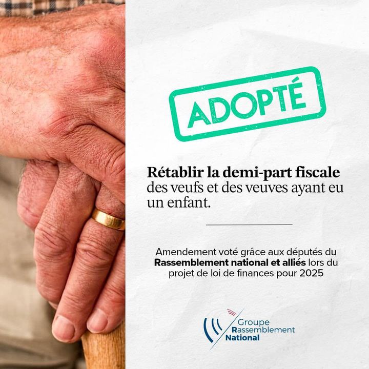 ✅ Grande victoire obtenue grâce aux députés du Groupe Rassemblement National : le rétablissement de la demi-part fiscale pour les veufs et les veuves.