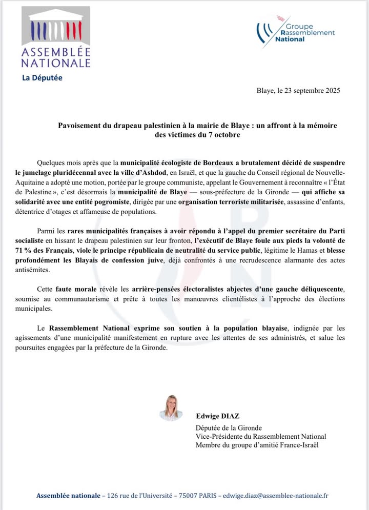 Parmi les rares municipalités françaises à avoir répondu à l’appel du premier secrétaire du Parti socialiste en hissant le drapeau palestinien sur leur fronton, l’exécutif de Blaye foule aux pieds la volonté de 71 % des Français, viole le principe républicain de neutralité du service public, légitime le Hamas et blesse profondément les Blayais de confession juive, déjà confrontés à une recrudescence alarmante des actes antisémites.