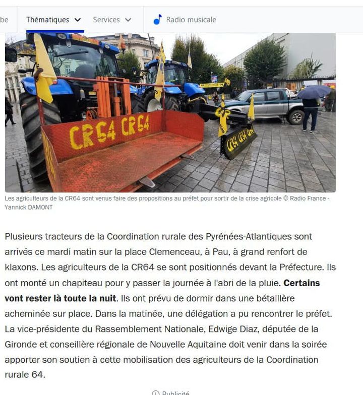 📰 https://www.francebleu.fr/infos/agriculture-peche/video-crise-agricole-la-coordination-rurale-s-installe-pour-24-heures-devant-la-prefecture-a-pau-9735539