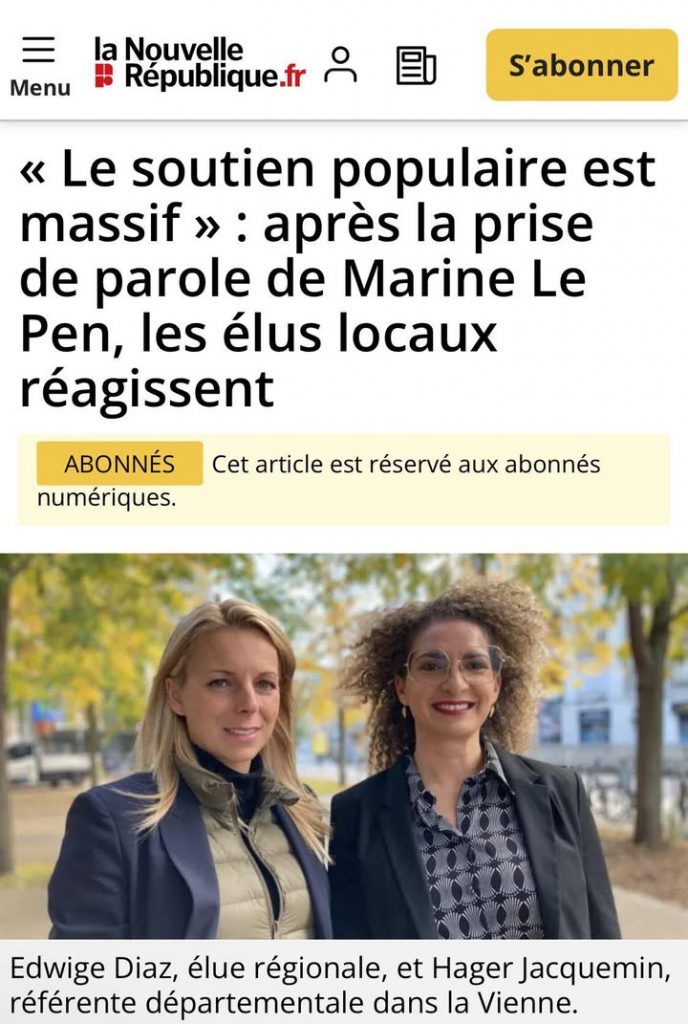 📰 Avec Hager Jacquemin, déléguée départementale du Rassemblement National de la Vienne, Eric Soulat, conseiller régional du groupe Rassemblement National – Nouvelle Aquitaine et Xavier Monnais, maire de Thollet, nous le confirmons : notre soutien à l’égard de Marine Le Pen et indéfectible.