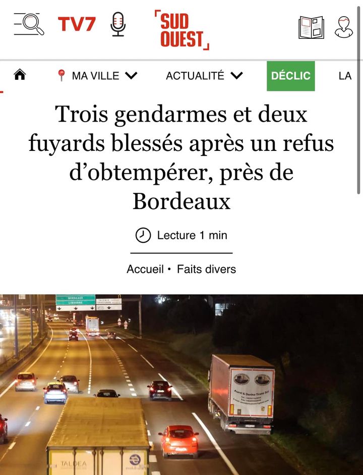 https://www.sudouest.fr/faits-divers/trois-gendarmes-et-deux-fuyards-blesses-apres-un-refus-d-obtemperer-pres-de-bordeaux-21849879.php
