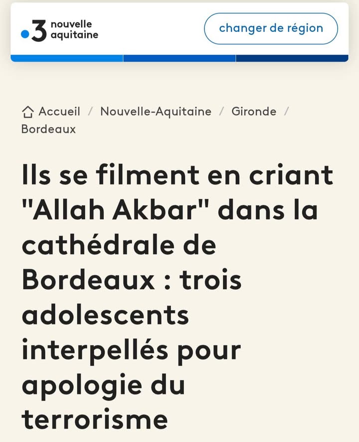 Quelques heures après l’attaque sur l’île d’Oléron, des individus ont scandé « Allah Akbar » dans la cathédrale de Bordeaux.