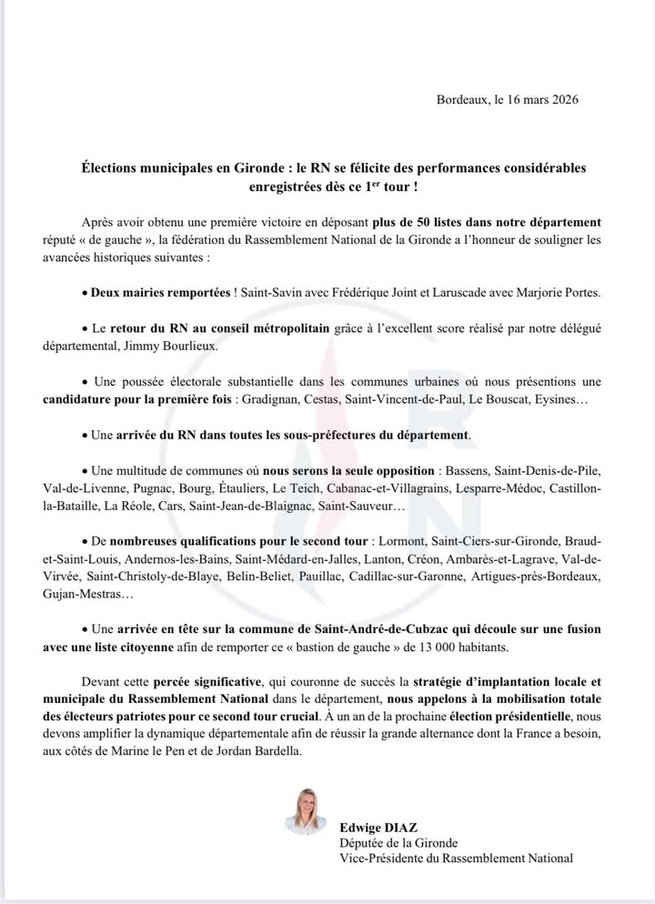 🗳️ Élections municipales en Gironde : le Rassemblement National se félicite des performances considérables enregistrées dès ce 1er tour !