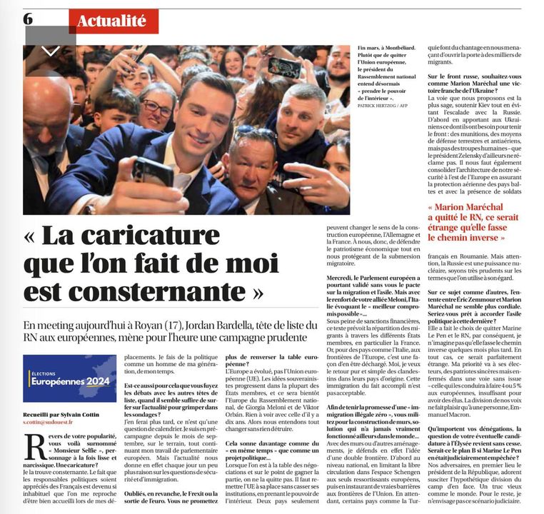 🥐 Ce matin, lisez l’interview de Jordan Bardella dans Sud-Ouest,