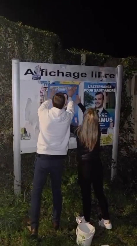 🪣📜🇫🇷 Collage d’affiches hier soir à Saint-André-de-Cubzac suite à l’excellent résultat de notre tête de liste Rassemblement National, Pierre Le Camus – L’alternance pour Saint-André !